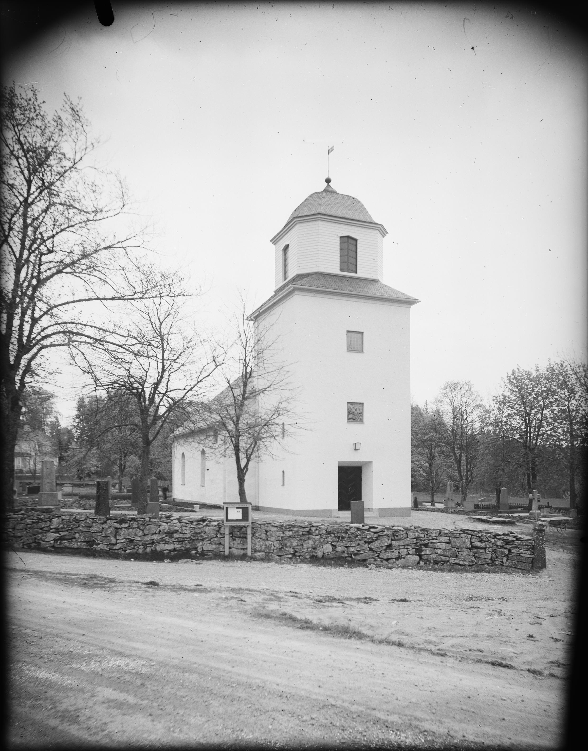 Kyrkan från nordväst. Långhus med ett lågt torn i väster.