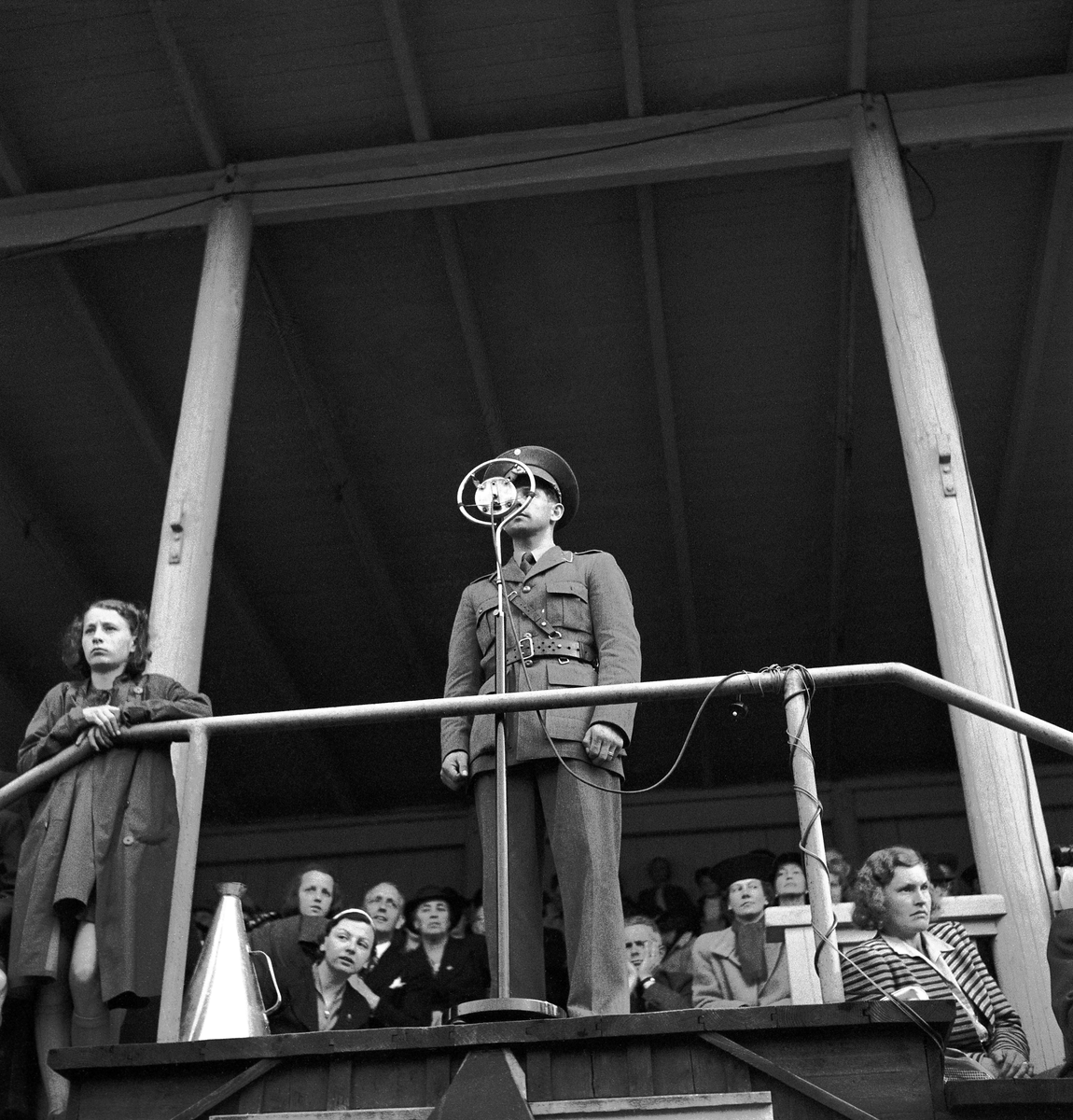 En man i militäruniform talar i mikrofonen på läktaren till Värendsvallen.