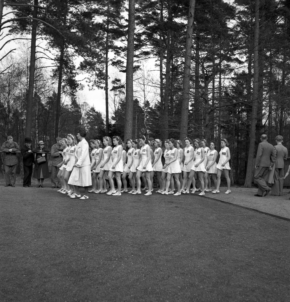 Kvinnliga gymnaster tågar in på Värendsvallen, åtföljda av en