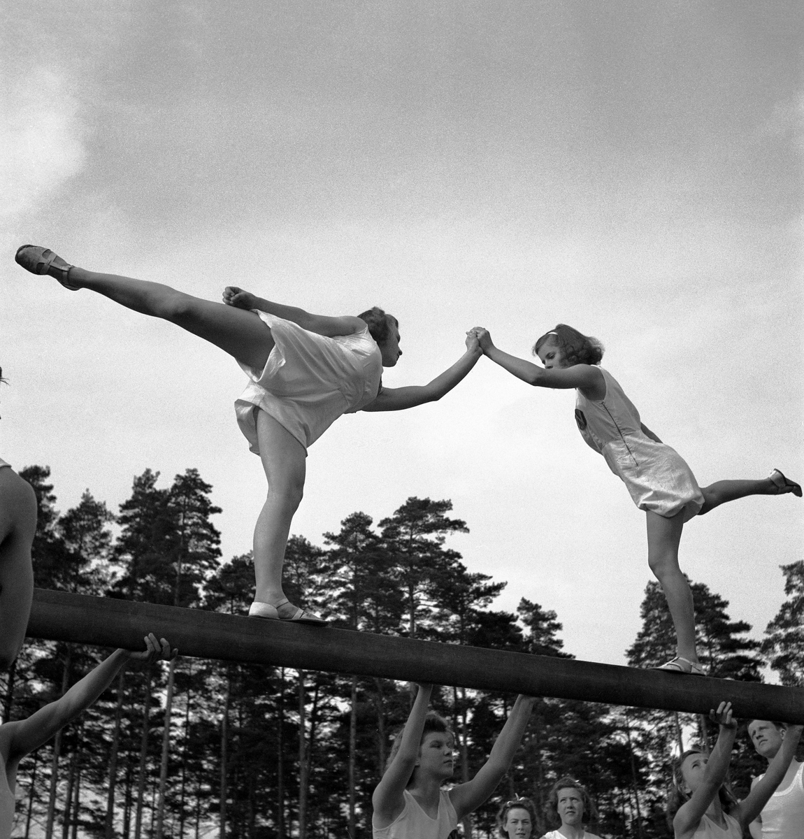 Titel: Gymnastikuppvisningen, 25/5 1941. Kvinnliga gymnaster har uppvisning på bom.