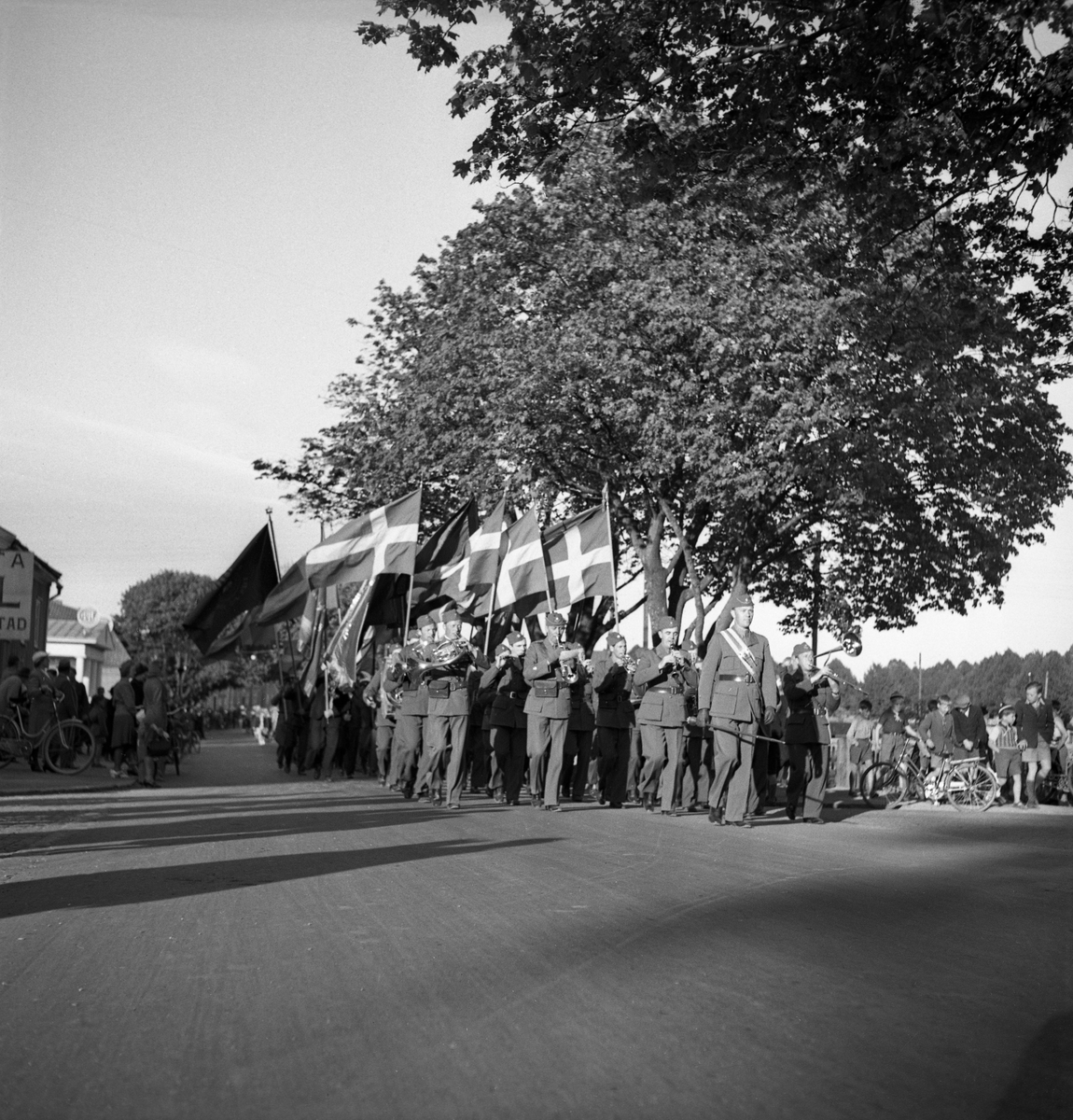 Titel: Svenska Flaggans dag, 6/6 1941. Marsch med musikkår och flaggbärare.