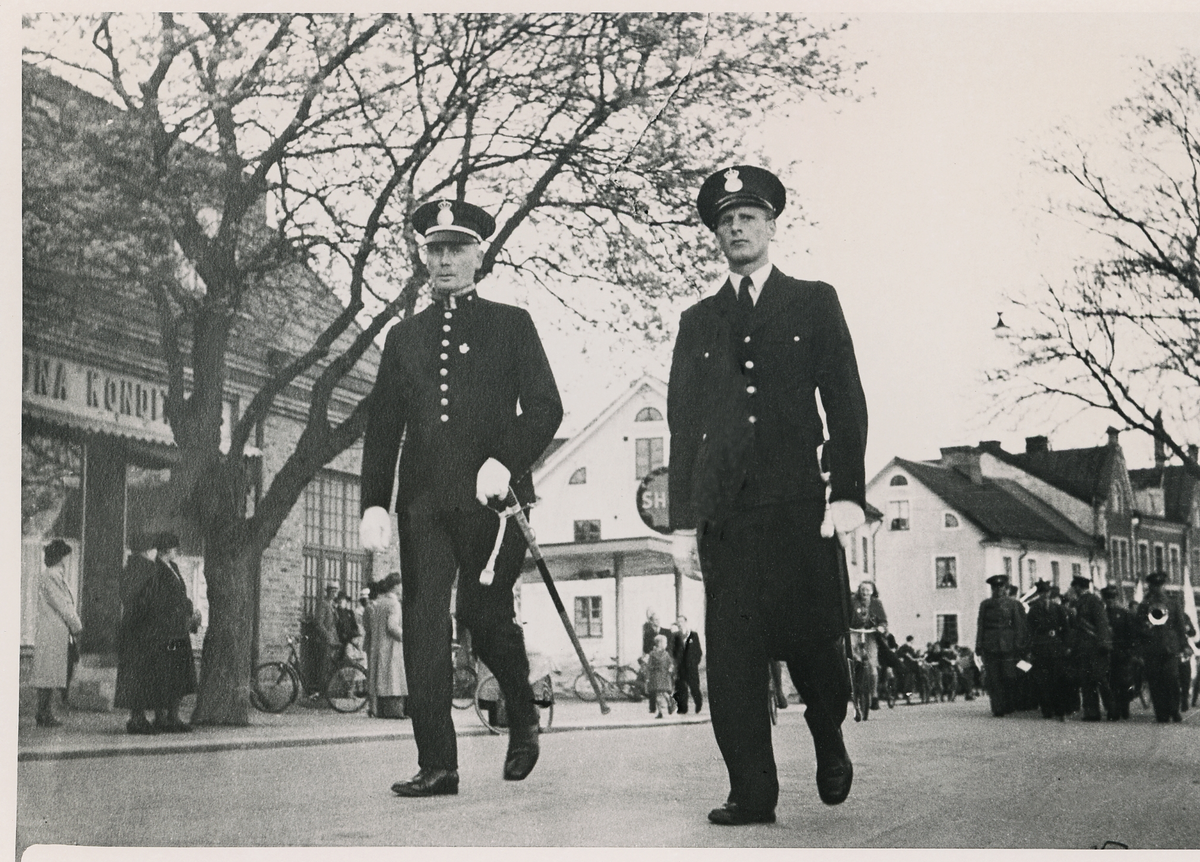 Poliskommissarie Frana Konrad Swanström (t.v.) på Storgatan, i täten för ett demonstrationståg, ca 1940.