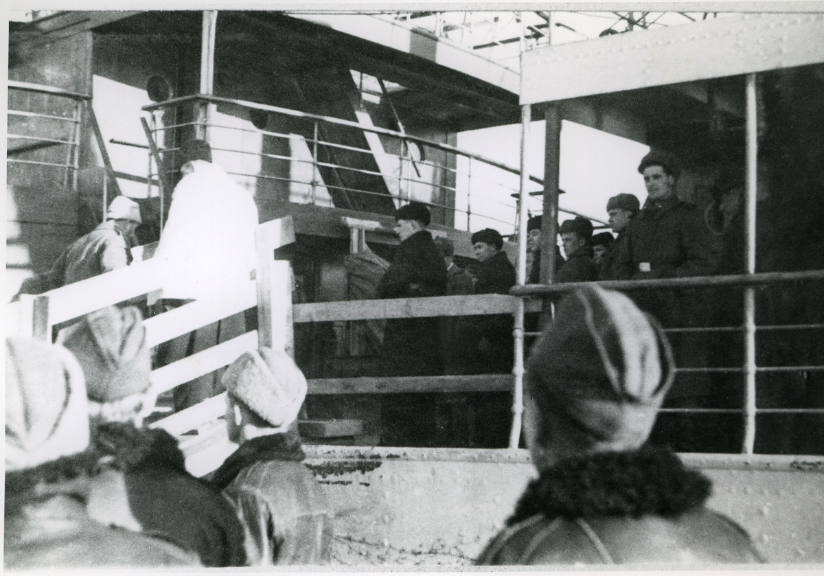 Hamnen i Trelleborg, troligtvis på morgonen, 25 januari 1946, med det sovjetiska fartyget Beloostrov som skulle hämta balterna.