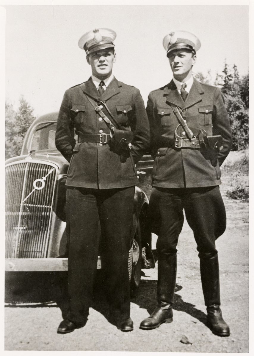 Poliskonstaplarna Carl-Erik Calding och Uno Logarn framför en polisbil. Ca 1945.