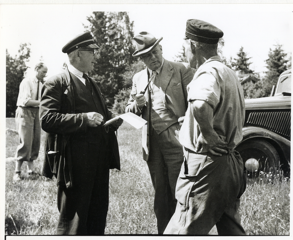 Brottsplatsutredning, 1949. Konstapel Uno Logarn til vänster och i mitten överkonstapel Gösta W. Axelsson med hatt och pipa.