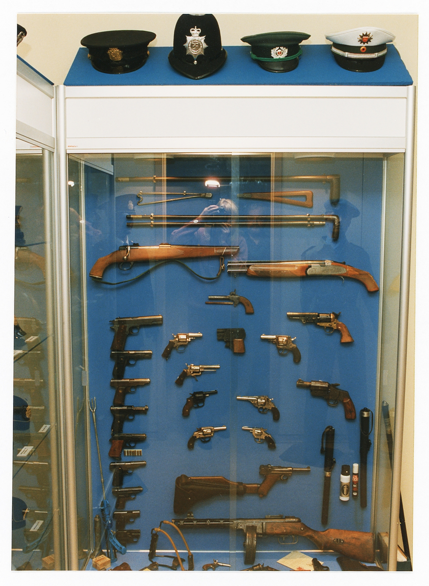 Polismuseet, Växjö,1992. Interiör med monter innehållande diverse olika stick och skjutvapen. Ovanpå montern syns några olika utländska polismössor.