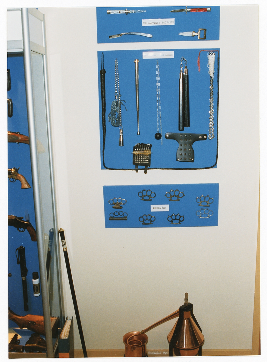 Polismuseet, Växjö,1992. Interiör med diverse beslagtagna eggvapen och andra vapen. På golvet skymtar en hembränningsapparat.