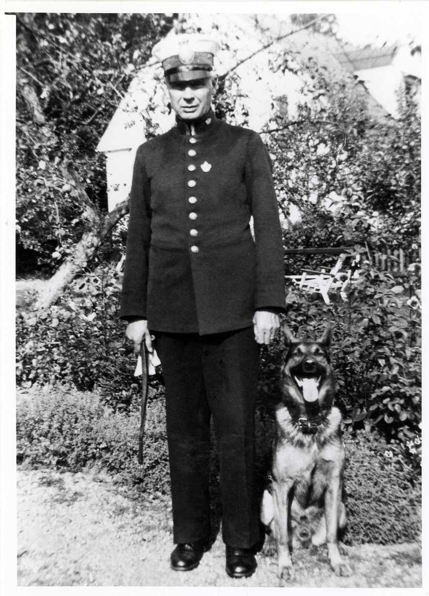 Överkonstapel Manfred Lundin med hund i en trädgård någonstans i Växjö, 1941.