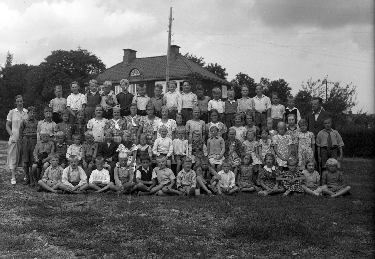 Titel: Foto av två skolklasser med lärare, som samlats utanför skolan.
