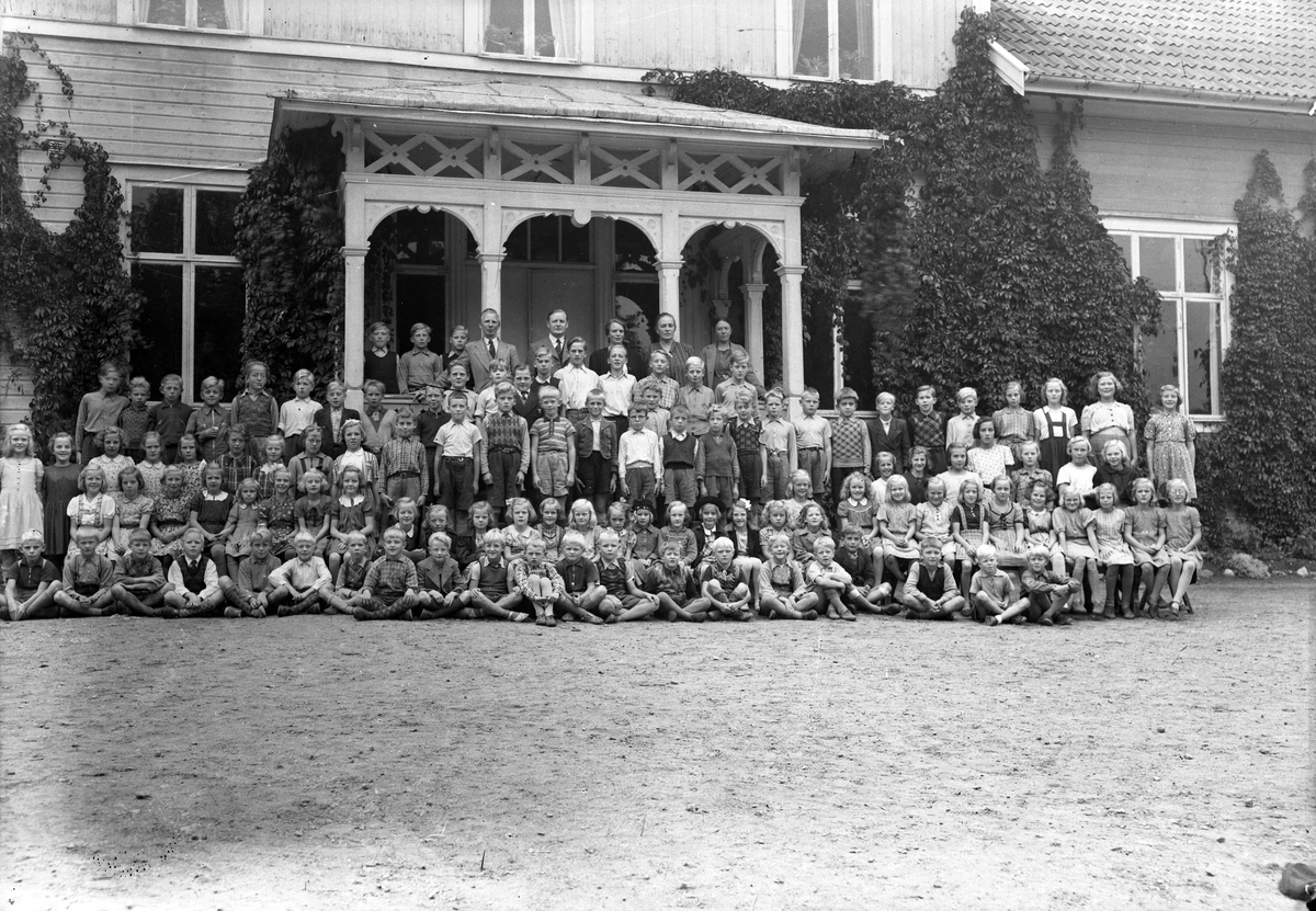 Foto av en hel skola med lärare, som samlats utanför skolan.