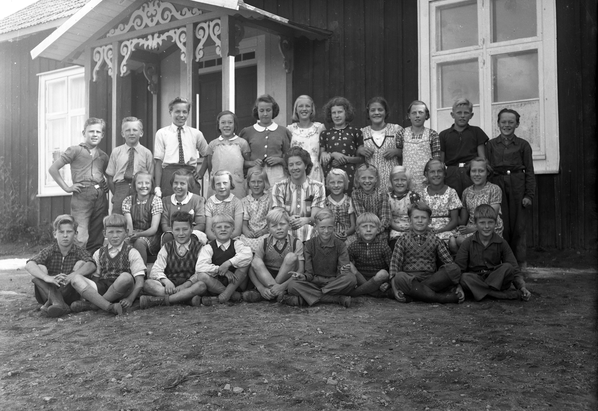 Foto av en skolklass med lärarinna, som samlats utanför skolan.