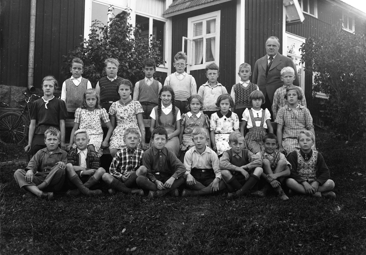 Titel: Foto av en skolklass med lärare, som samlats utanför skolan.