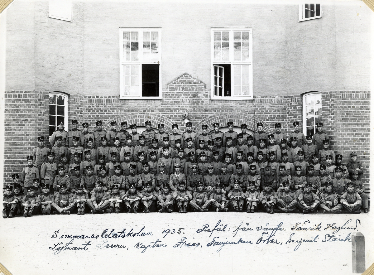 Befäl (1:a radens mitt), fr.v.: fänrik Haglund, löjtnant Cervin, kapten Fries, fanjunkare Öster och sergeant Starck.