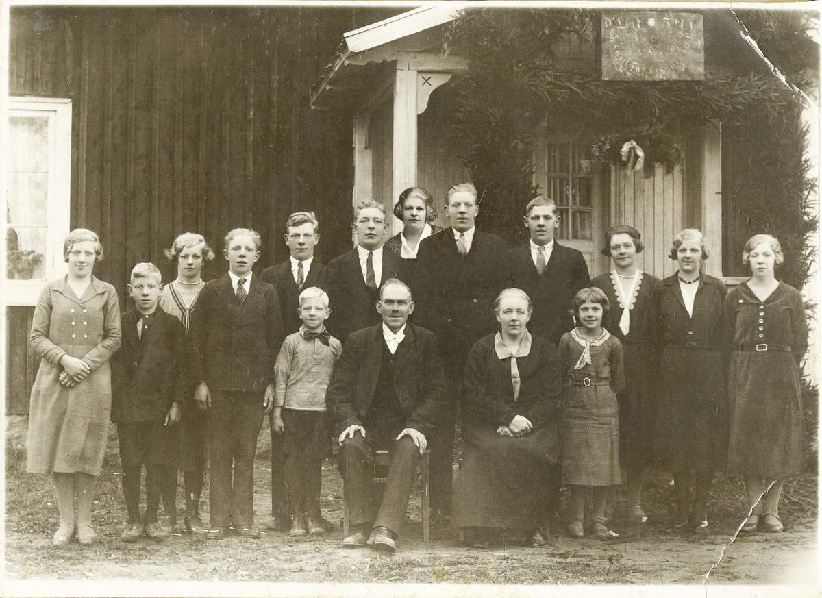 Fr. v. i övre raden: Signe, g. Pettersson, Lennart Karlsson, Elsa, g. Dahlberg, John Karlsson, Ture Karlsson, Arthur Carlsson, Ester, g. Pettersson, Henning Karlsson, Erik Karlsson, Gerda Karlsson, Karin, g. Rubin och Anna-Lisa, g. Gunnarsson.