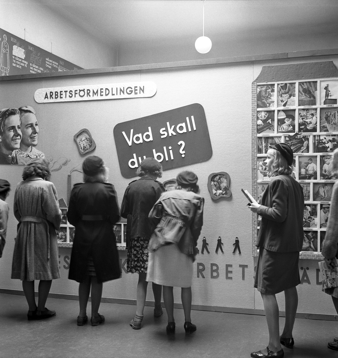 Aktiv Ungdom, 1943. Skärm om Arbetsförmedlingen. Interiör av utställningen "Aktiv Ungdom" på Smålands Museum.