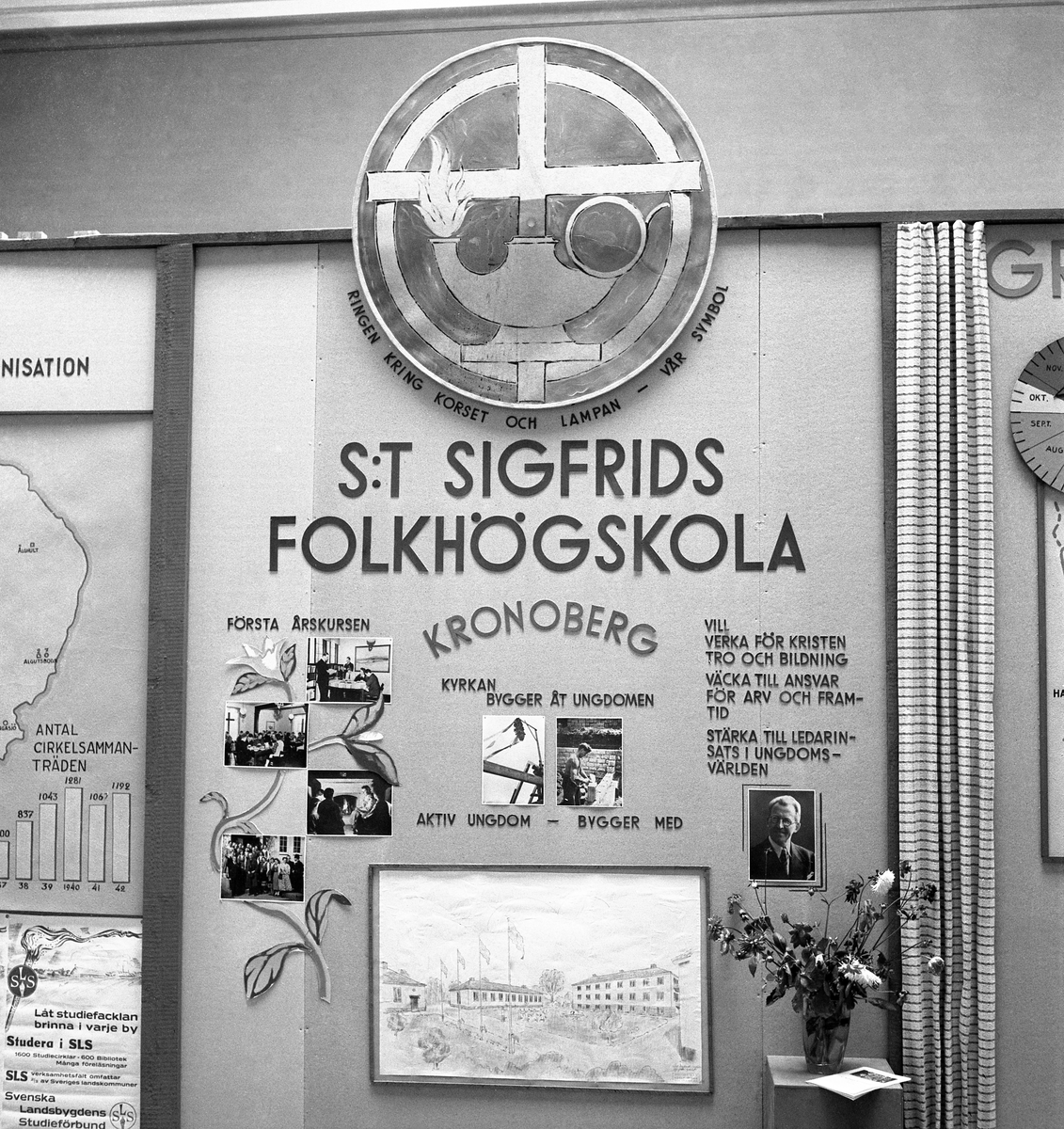 Aktiv Ungdom, 1943. Skärm om S:T Sigfrids Folkhögskola. Interiör av utställningen "Aktiv Ungdom" på Smålands Museum.