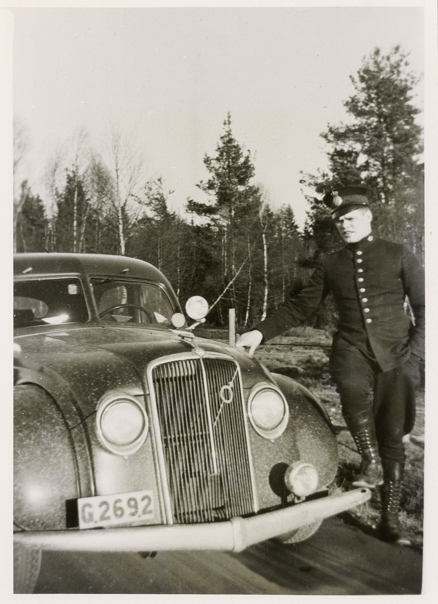 Poliskonstapel Carl-Erik Calding på uppdrag vid statspolisens bil, 1939.