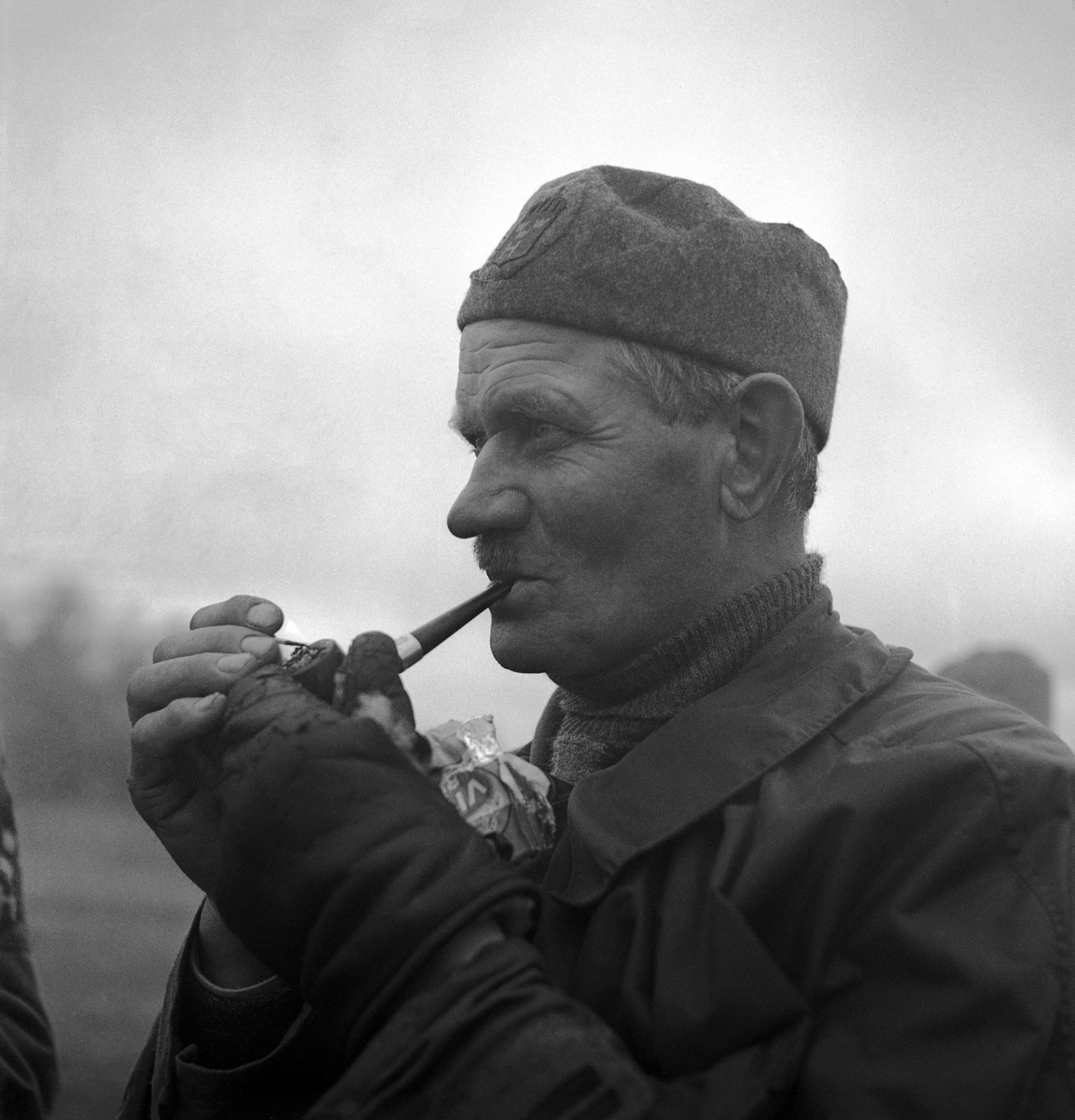 Titel: Hemvärnet. 20/4, 1941. En äldre hemvärnsman röker pipa.