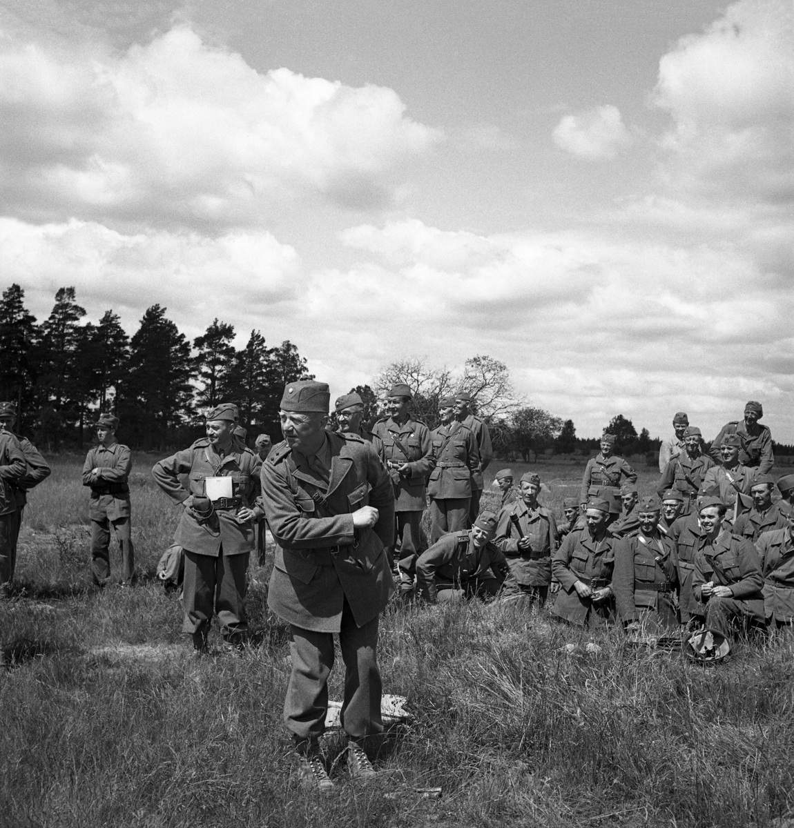 Några män i hemvärnsuniform ser på, när en äldre man i uniform