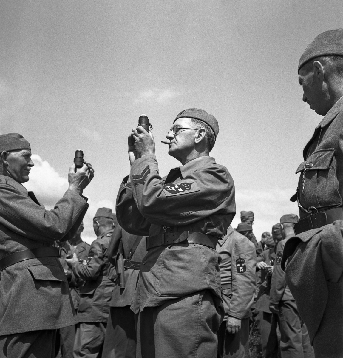 Några män i hemvärnsuniform undersöker handgranater.