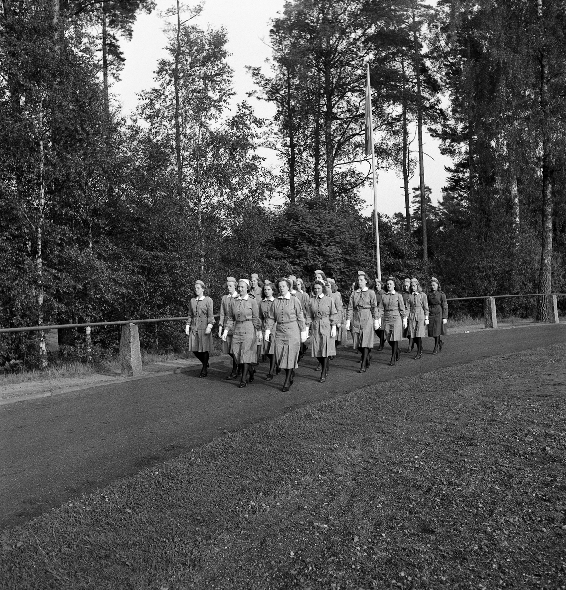 Ett antal kvinnor i någon sorts uniform tågar in på Värendsvallen.