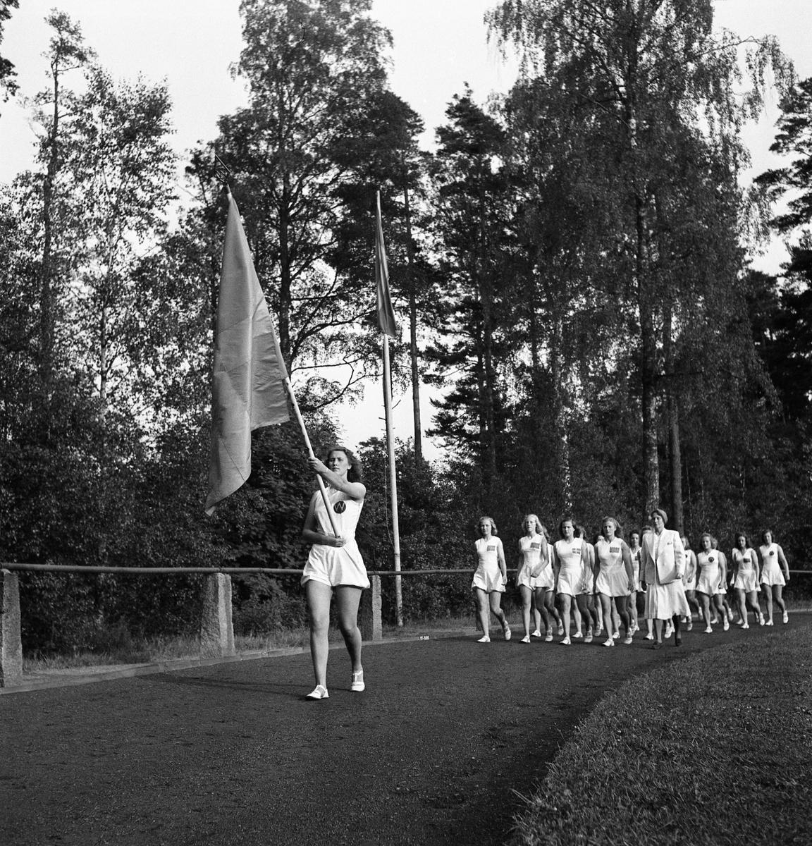 Ett antal kvinnliga gymnaster i vita gymnastikdräkter, tågar in