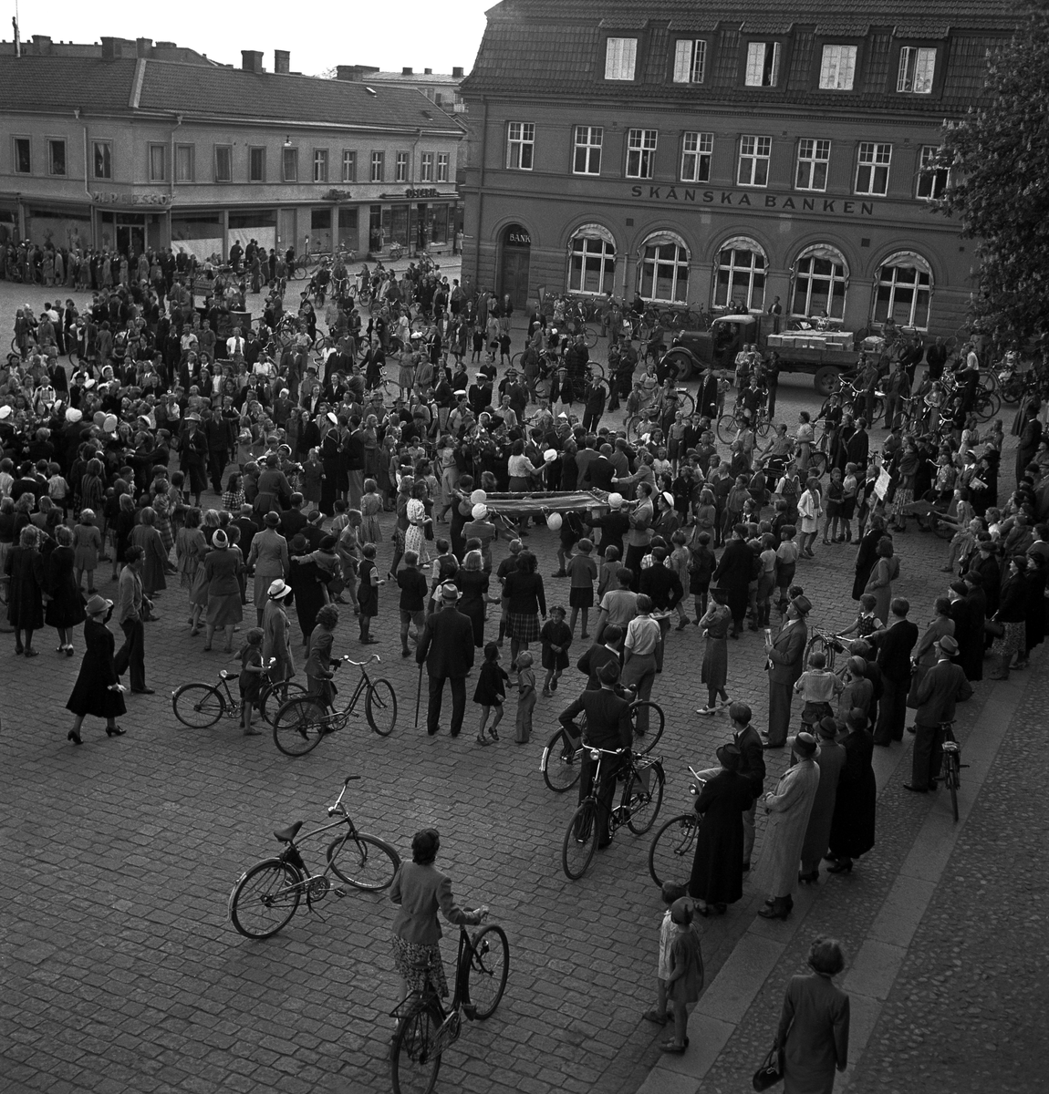 Studenterna, 3/6 1941. Vy från Stortorget (Residenset ?) mot Kungsgatan (P.N. Perssons hörna och dåv. Skånska Banken), och det pågående studenttåget.