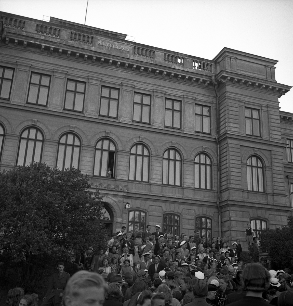 Studenterna, 4/6 1941. Studenter och anhöriga m. fl., har samlats på trappan utanför dåv. Växjö Högre Allmänna Läroverk.