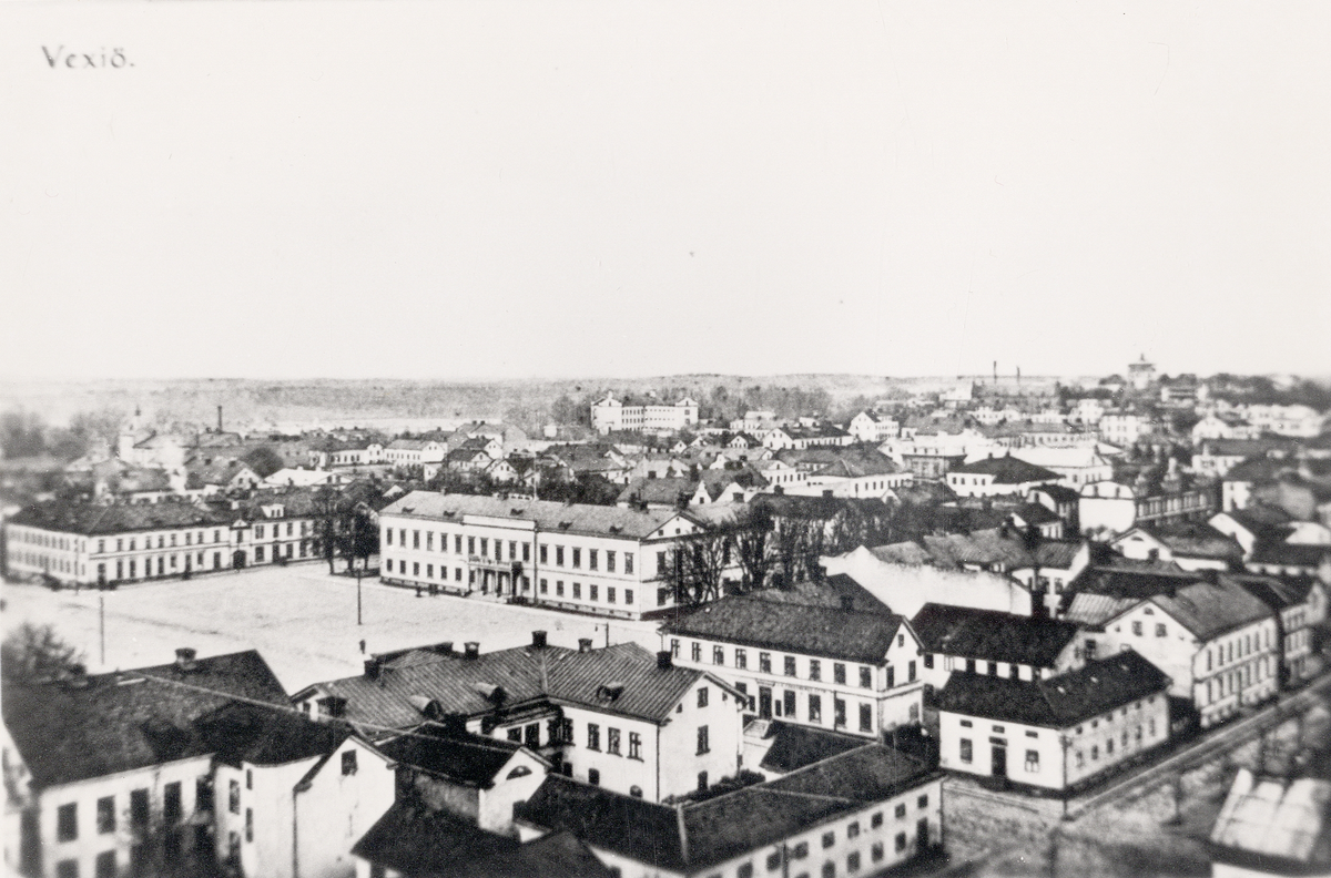 Vy från domkyrkotornet över stortorget, Växjö, med bl a residenset, mot nordväst. I bakgrunden skymtar man fängelset och Kristinebergs bryggeri. Ca 1900.
