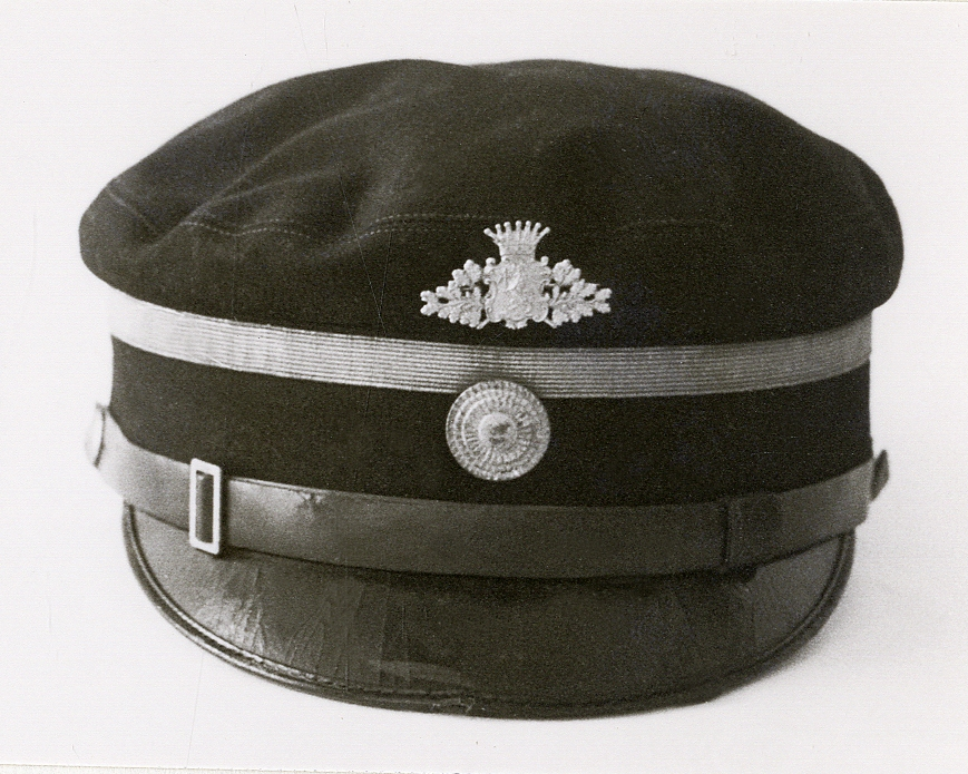 Äldre fjärdingsmansmössa, med kokard. Mössmärke i mässing, avbildande Smålands landskapsvapen under hertigkrona.