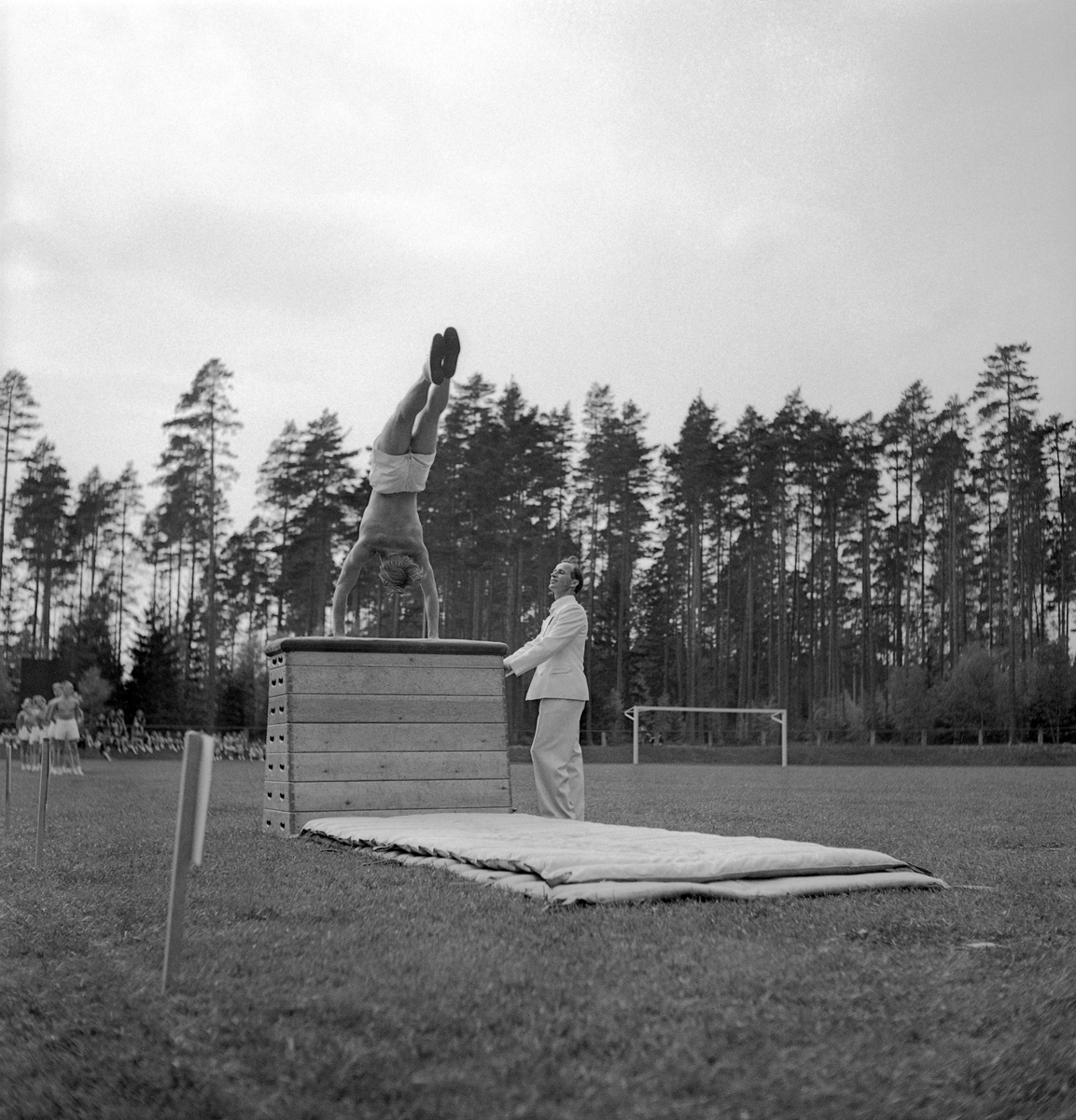 Gymnastikuppvisning på plint, av manliga gymnaster.