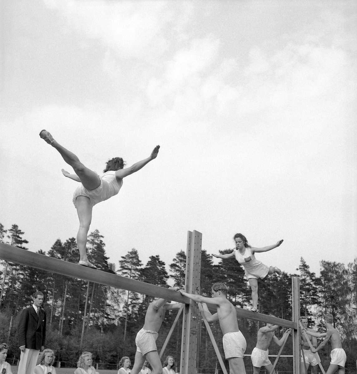 Gymnastikuppvisning på bommar av kvinnliga gymnaster, med