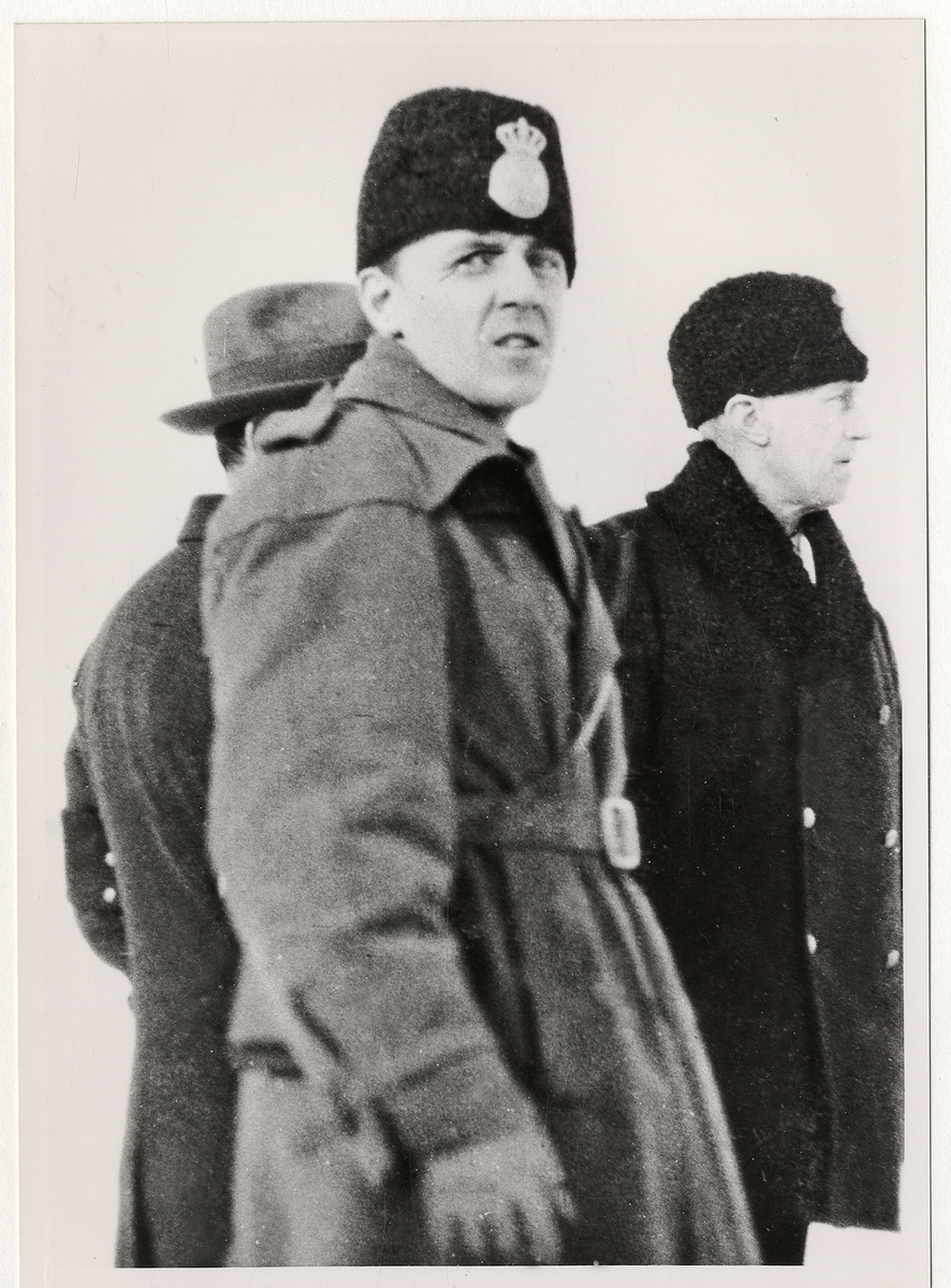 Tre män, varav två i polisiär vintermundering, av allt att döma under en tjänsteförrättning.