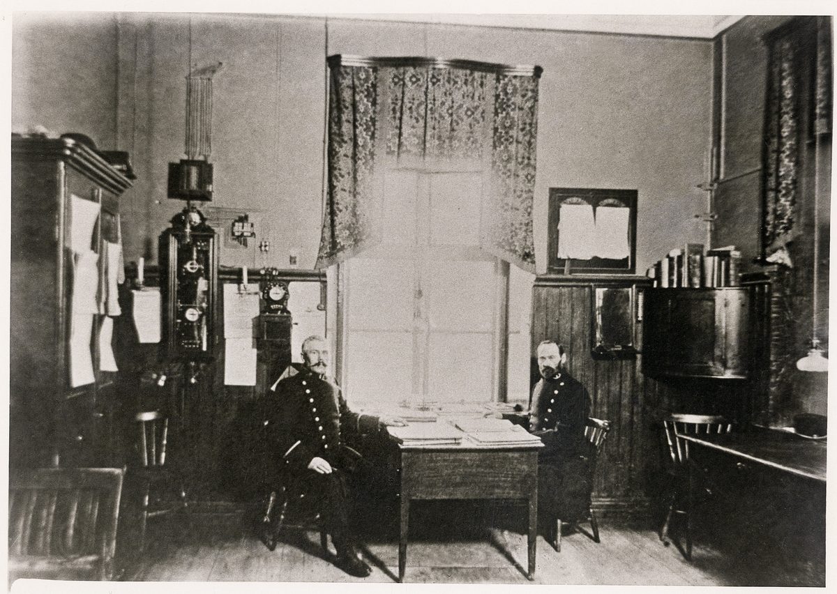 Interiör från polisstationen i Växjö 1904, i nuvarande stadshotellet. Vid skrivbordet sitter överkonstapel Carl Johansson och poliskonstapel J P Bergström.