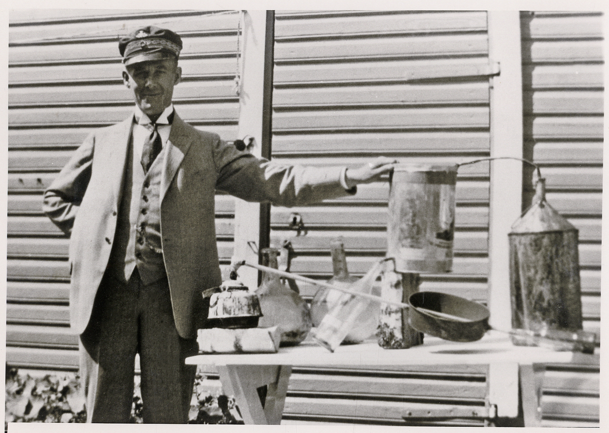 Landsfiskal Gustaf Öhrstam, Alvesta, med en beslagtagen hembränningsapparat, ca 1930.