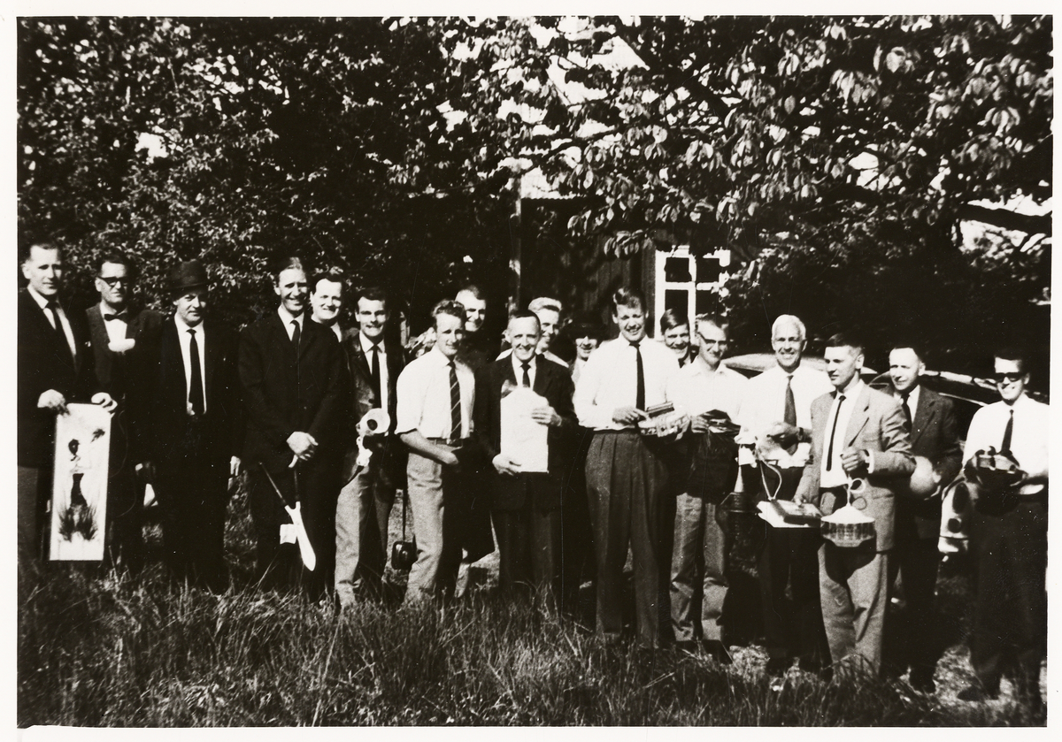 Fr.v.: Börje Engerby, Gunnar Wikander, David Sandström, Harald Braw, Olle Hedman (Tingsryd), Håkan Johansson, Sven Johansson, Jarl Strand, ...Alfredsson, Långasjö, Arne Älmefalk, Åseda, Carl Jonsson, Ingelstad, Olof Dahlgren, ...Karlsson, Skruv,...Kindberg, landsfiskal i Skruv, Lennart Johansson och Gösta Johansson.