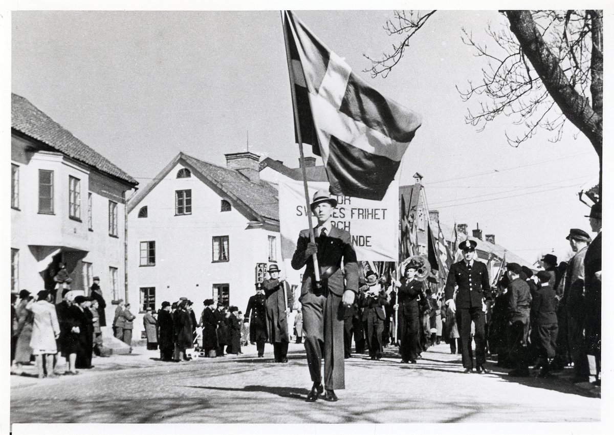 Överkonstapel Manfred Lundin och konstapel Erik Dahl ledsagar medborgartåget genom Växjö, 1/5 1940.