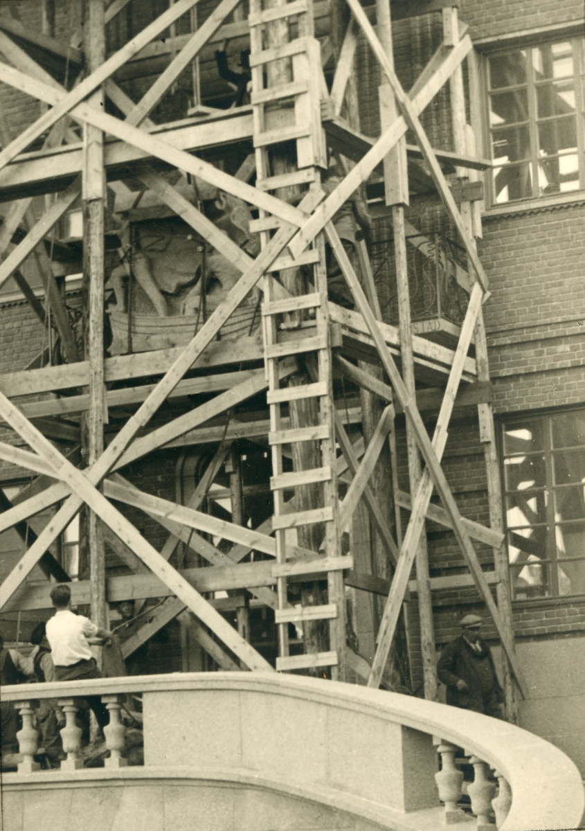 Reliefen "Snöfrid" monteras på plats. Bild tagen i samband med arbetet att uppföra Gävle Museum åren 1938-40.