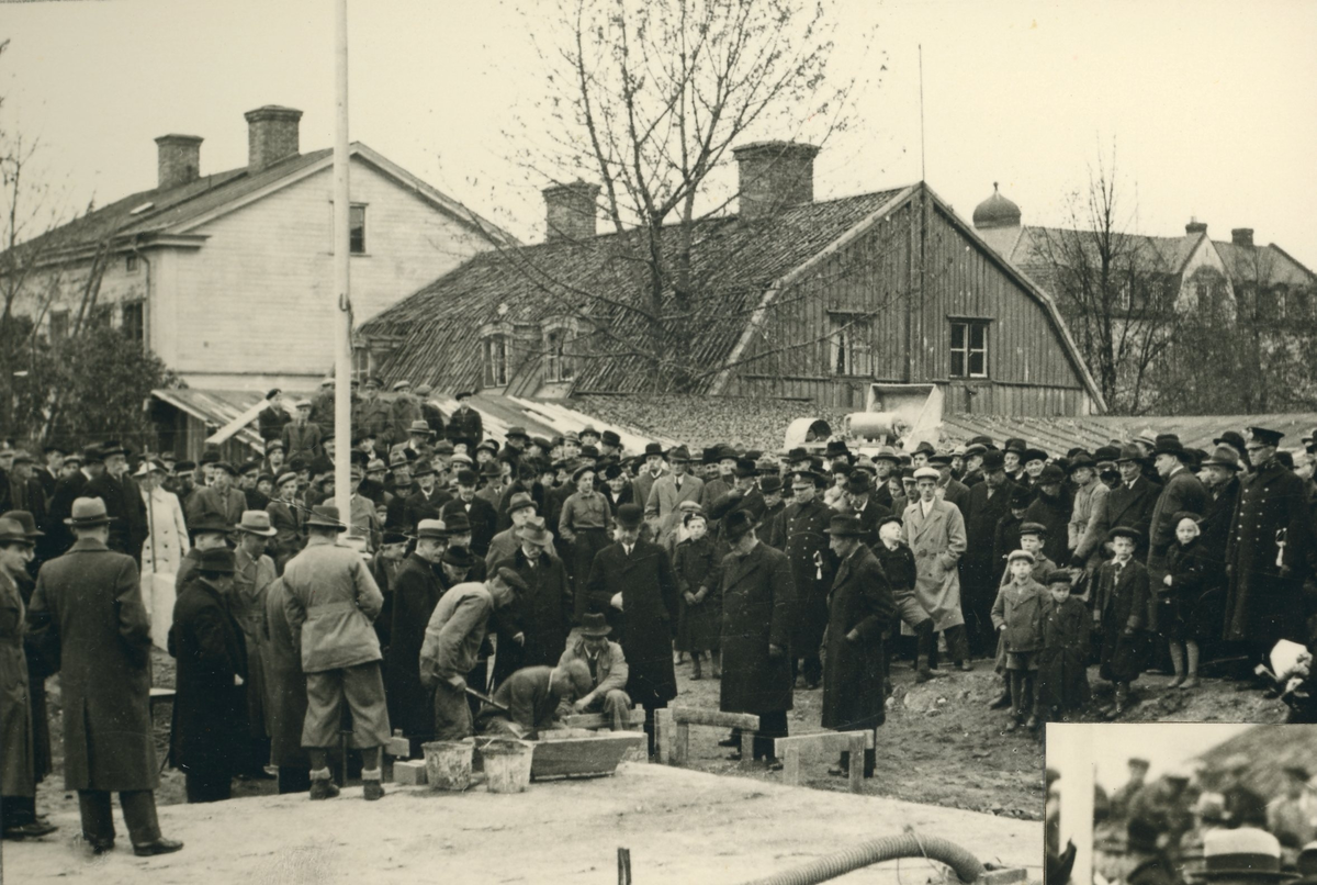 Grundstenen för Gävle Museum lägges 26 oktober 1938. Några byggnadsarbetare är i färd med att slutföra arbetet för dagen.