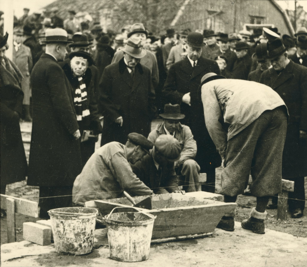 Grundstenen för Gävle Museum lägges 26 oktober 1938. Några byggnadsarbetare är i färd med att slutföra arbetet för dagen. Borgmästare Nils Berlin m.fl. övervakar arbetet.