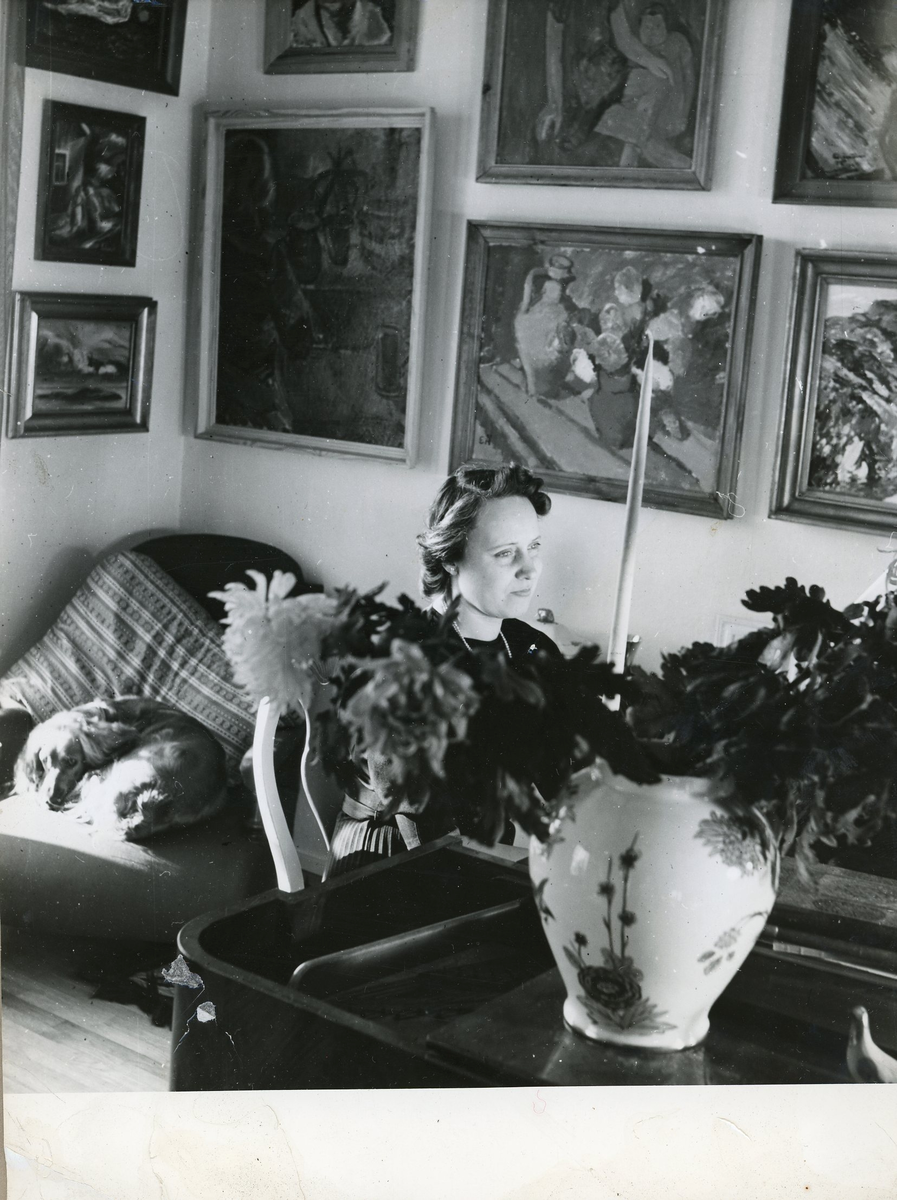 Titel: Fotografi av Dagmar Humbla vid ett piano i sitt hem.