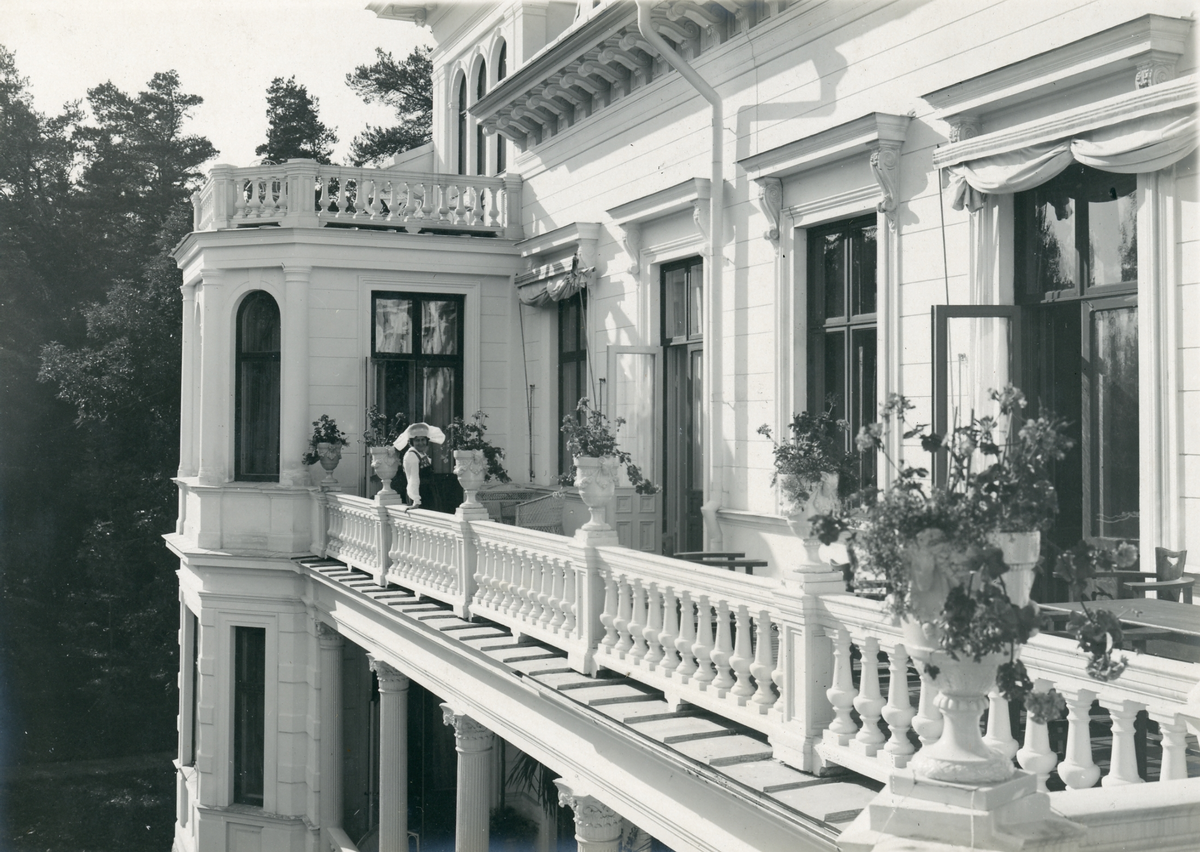 Kvinna med hembygdsdräkt som lutar sig mot ett balkongräcke vid Engeltofta, Norrlandet.
