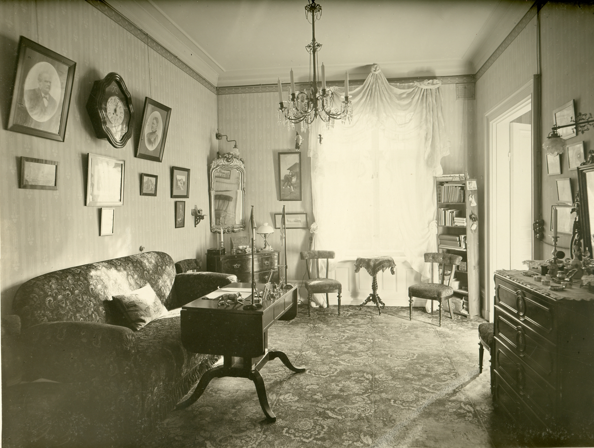 Bilder av släkten Brodin från hemmet på Norrlandet. Rum inifrån lantstället "Marieberg", Norrlandet. Porträtt av Olof August Brodin och fru Axelina Brodin över soffan.