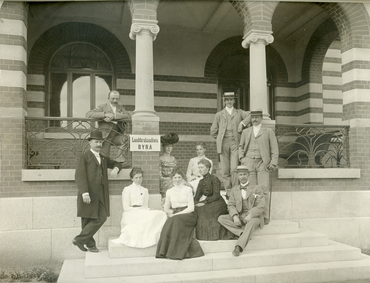 Kvinnor och män sitter och står utanför Landtbruksmötets byrå.