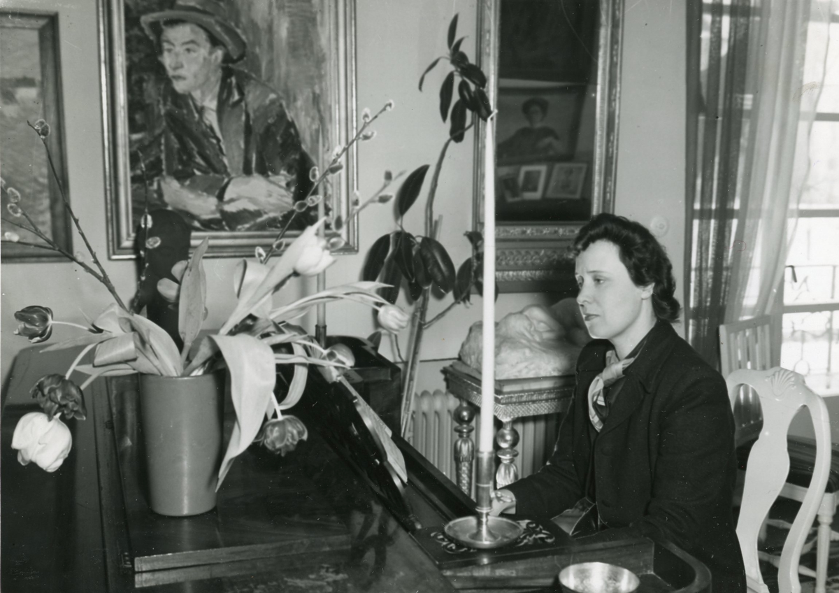 Hemma hos Dagmar och Philibert Humbla, Länsintendent Fil. Doktor vid Gävle Museum. Dagmar sittandes vid pianot.