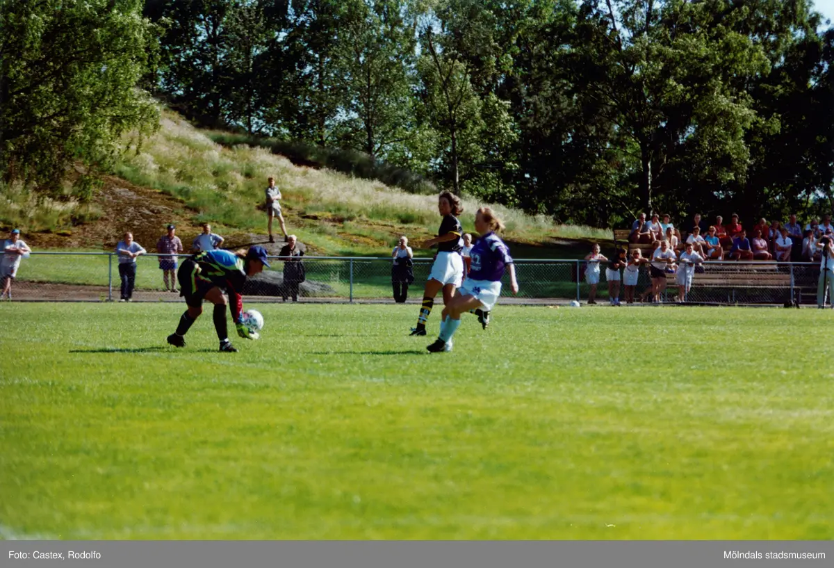 Fotbollslaget Jitex BK spelar match mot AIK på Kvarnbyvallen i Mölndal, sommaren 1995. Slutresultatet är okänt.