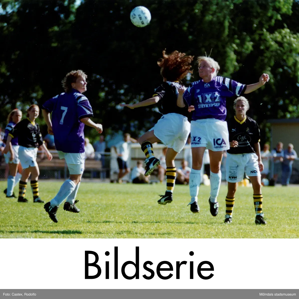 Serie om fyra fotografier som visar fotbollslaget Jitex BK spela match mot AIK på Kvarnbyvallen i Mölndal, sommaren 1995. Slutresultatet är okänt.