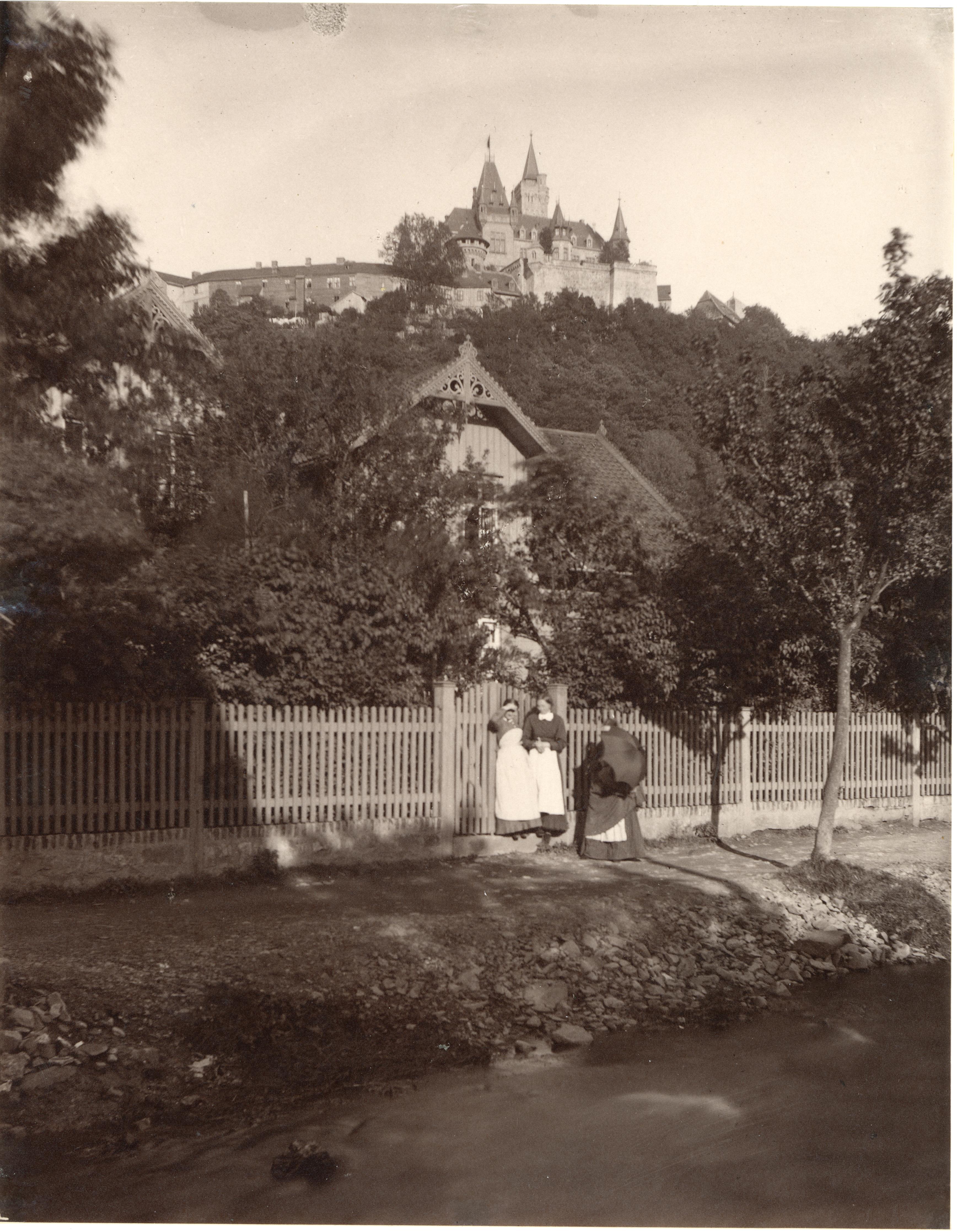 Wernigerode slott i bakgrunden. Tre kvinnor i förgrunden. Bilden troligen tagen 1885-1890.