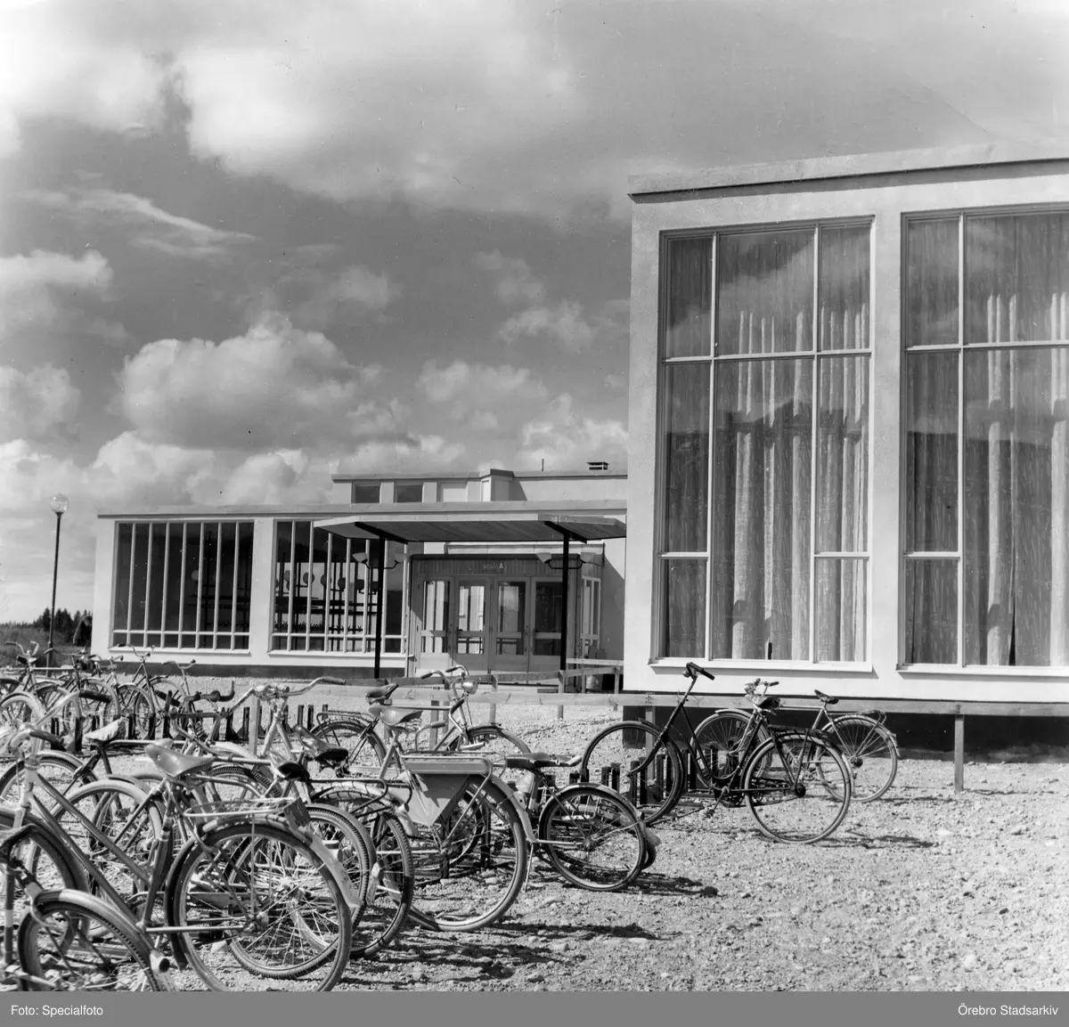Cyklar parkerade framför Rostaskolans enorma fönster, 1960