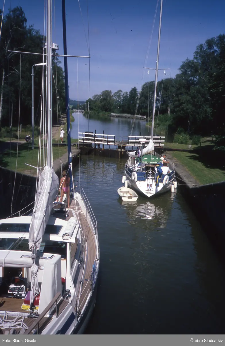 Båtar väntar vid Hajstorps nedre sluss på Göta kanal, 1991